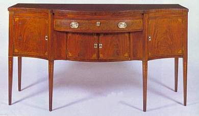 Very fine Federal inlaid mahogany serpentine-front sideboard, the oblong top with inlaid edge above an inlaid frieze drawer, two bowed cupboard doors flanking and centering two cupboard doors, the whole inlaid with quarter-round fan devices, on husk and line-inlaid square tapering legs ending in crossbanded cuffs. Brasses appear to be original.