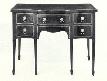 Very fine George III inlaid mahogany side board, the shaped rectangular top above a central drawer flanked by a bottle drawer and a hinged cupboard door veneered to simulate drawers enclosing a shelf, raised on straight tapering legs terminating in spade feet. Circa, 1790 36 ½" high (92.5 cm.); 4' ½" long (1.23 m.) |