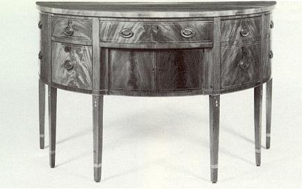 Very fine Federal inlaid mahogany half-round sideboard, the top with inlaid edge above a case comprising two frieze drawers, a large bottle drawer, a deep drawer and a air of cupboard doors, cupboard doors flanking, on six bellflower and line inlaid square tapering legs ending in crossbanded cuffs. Some restoration to top and veneer. Baltimore, circa 1790-1800 37 ½" high (95 cm.); 4' 11 ½" long (1.52 m.); 29" deep (63 cm.) |